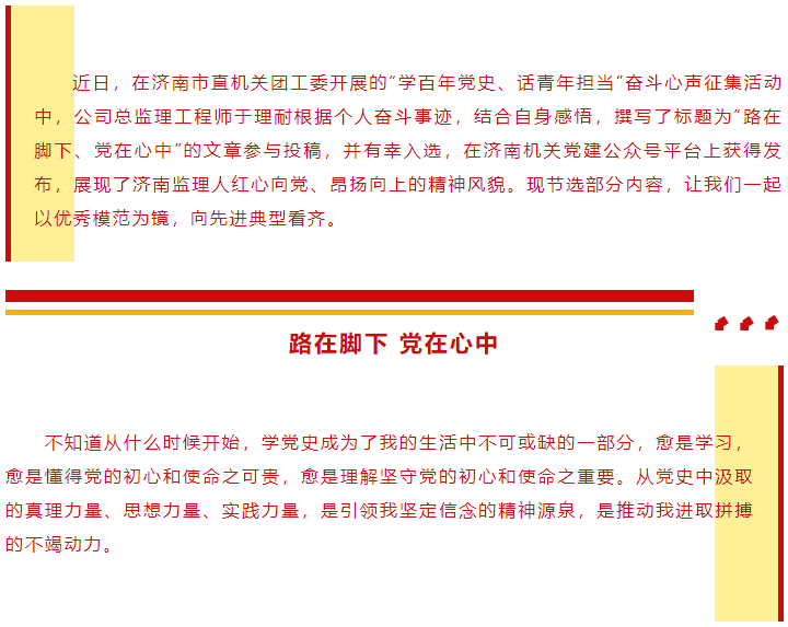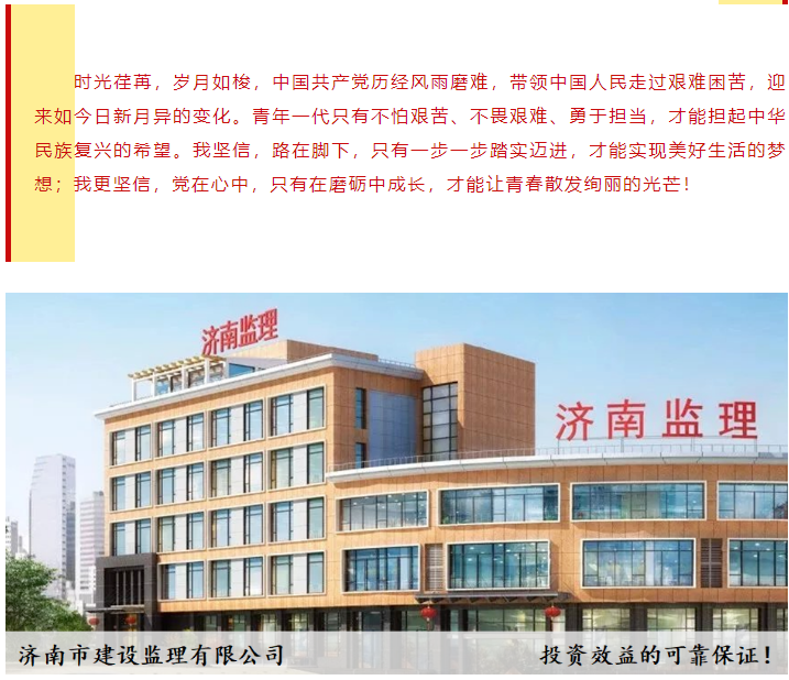 濟(jì)南監(jiān)理總監(jiān)理工程師于理耐奮斗事跡獲市直機關(guān)團(tuán)工委“學(xué)百年黨史 話青年擔(dān)當(dāng)”奮斗心聲活動展播